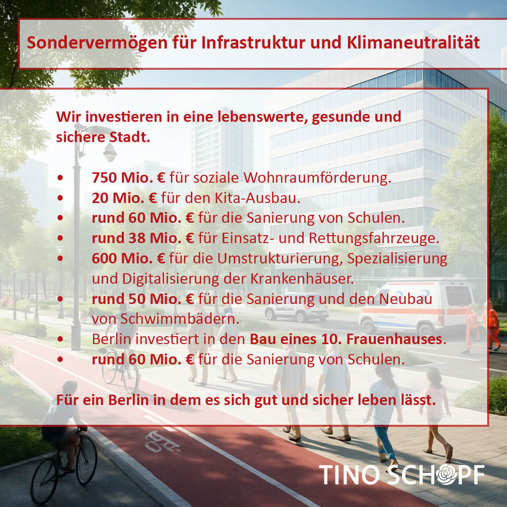 Wir investieren in eine lebenswerte, gesunde und sichere Stadt: 750 Mio. Euro fließen in die soziale Wohnraumförderung, 20 Mio. Euro in den Ausbau von Kitas und rund 60 Mio. Euro in die Sanierung unserer Schulen. Für eine starke Gesundheitsversorgung stellen wir 600 Mio. Euro für die Umstrukturierung, Spezialisierung und Digitalisierung der Berliner Krankenhäuser bereit. Zudem investieren wir rund 38 Mio. Euro in moderne Einsatz- und Rettungsfahrzeuge sowie rund 50 Mio. Euro in die Sanierung und den Neubau von Schwimmbädern. Und: Berlin baut ein weiteres, das zehnte, Frauenhaus.