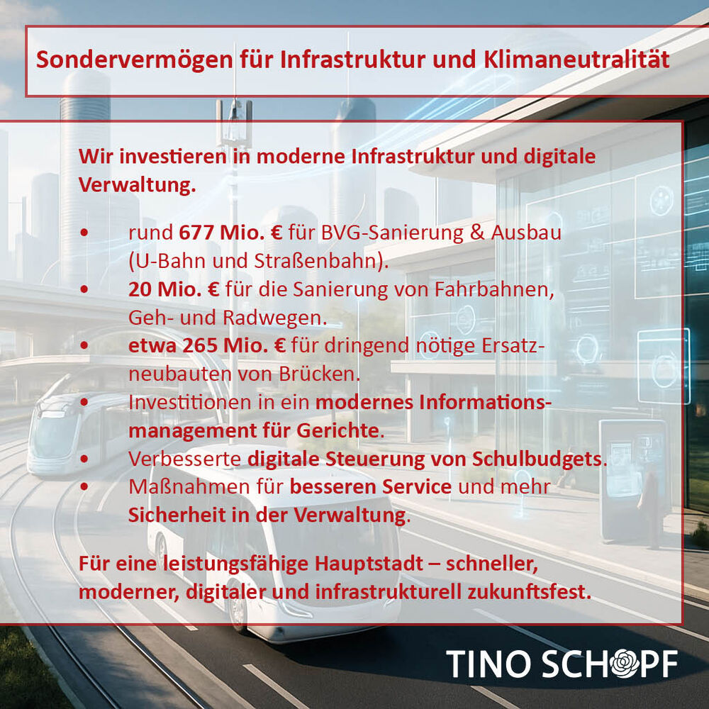 Wir investieren in moderne Infrastruktur und eine digitale Verwaltung: Rund 677 Mio. Euro fließen in die Sanierung und den Ausbau von U-Bahn und Straßenbahn, weitere 20 Mio. Euro in die Erneuerung von Fahrbahnen, Geh- und Radwegen. Zudem stellen wir etwa 265 Mio. Euro für dringend benötigte Brückenersatzneubauten bereit. Auch digital machen wir Berlin leistungsfähiger – mit einem modernen Informationsmanagement für Gerichte, einer verbesserten digitalen Steuerung der Schulbudgets und weiteren Maßnahmen für mehr Service und Sicherheit in der Verwaltung. Für eine Hauptstadt, die schneller, moderner und infrastrukturell zukunftsfest ist.