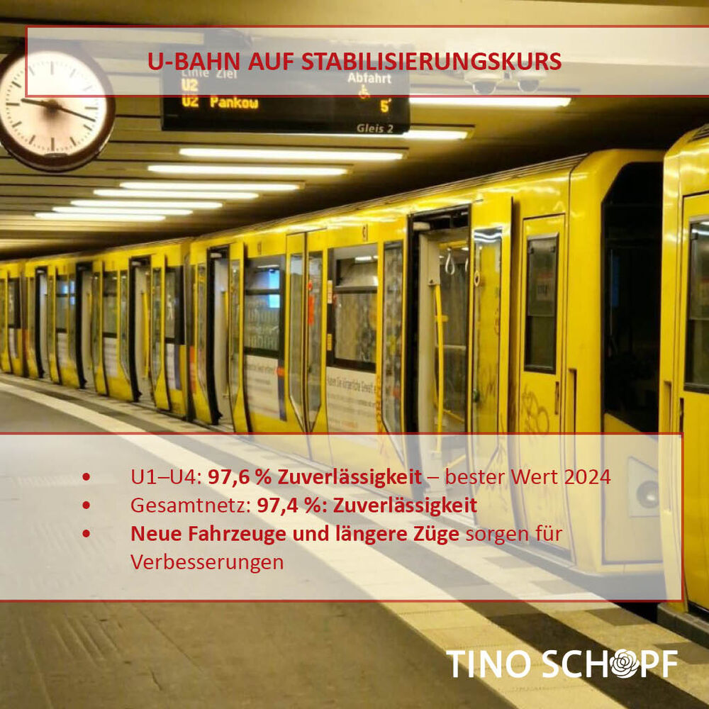 Die U-Bahn zeigt weiterhin einen positiven Trend: Besonders die Linien U1–U4 mit schmalem Tunnelprofil konnten zuletzt stark zulegen und erreichten 97,6 % Zuverlässigkeit – der bisher höchste Wert des Jahres. Im gesamten Netz liegt die Zuverlässigkeit aktuell bei 97,4 %. Leichte Rückgänge gab es vor allem bei den breiteren Linien U5–U9, hier sorgten zumeist externe Störungen wie herrenlose Gepäckstücke oder Personen im Tunnel für Verzögerungen. Ab dem BVG-Fahrplanwechsel Mitte Dezember wird die U3 voraussichtlich überwiegend mit acht-Wagen-Zügen unterwegs sein, und im Januar kehrt die U2 wieder zum regulären Vier-Minuten-Takt zurück. Die Modernisierung der Fahrzeugflotte zeigt somit bereits spürbare Verbesserungen für Fahrgäste.